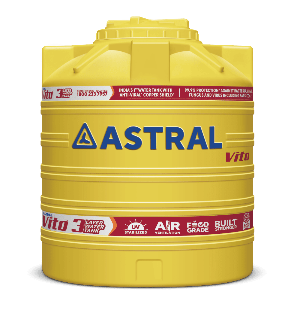 Astral Vito Water Tanks, feature an innovative inner layer infused with active copper particles. This groundbreaking technology ensures that your water stays fresh, clean, and free from harmful microbes at all times. Unlike conventional tanks, our tanks incorporate active copper fortification within the polymer system, preventing excessive copper leaching into the human body, while maintaining the efficacy of the anti-viral and anti-microbial copper shield throughout its lifespan.